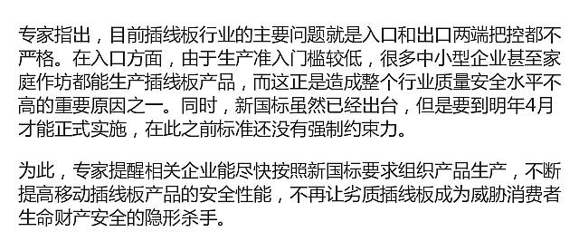 移動(dòng)插線板如果存在安全隱患,可能引發(fā)火災(zāi)、觸電等嚴(yán)重事故。為了提升插線板的安全性能,去年10月我國(guó)頒布了新的強(qiáng)制性國(guó)家標(biāo)準(zhǔn),并將于2017年4月正式開(kāi)始實(shí)施。