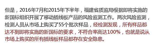 新國(guó)標(biāo)中還有一項(xiàng)重要的規(guī)定,就是所有的移動(dòng)插線板必須加裝安全保護(hù)門(mén),但是風(fēng)險(xiǎn)監(jiān)測(cè)中,所有移動(dòng)插線板樣品都沒(méi)有加裝保護(hù)門(mén),在這項(xiàng)檢測(cè)中,產(chǎn)品不符合率同樣是100%,這樣的插線板如果在有小孩的家庭、學(xué)校等場(chǎng)所使用非常不安全。