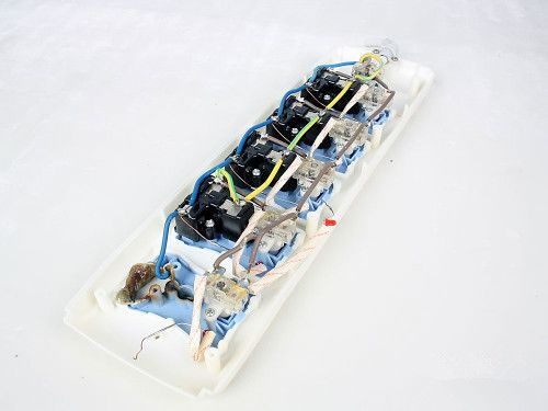 這一款排插在使用過程中,可以看到在最后一個插口位置已經(jīng)有燒焦的痕跡,顯然是已經(jīng)發(fā)生了安全問題,接口已經(jīng)被燒壞了。我們可以把它打開來看看,究竟它的問題出在什么地方。