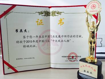 金大門(mén)業(yè)總經(jīng)理崔英杰先生榮獲201年度中國(guó)門(mén)業(yè)“十大風(fēng)云人物”