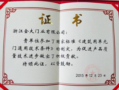 在隆重的頒獎(jiǎng)盛典上,浙江金大門(mén)業(yè)很榮幸的得到來(lái)自行業(yè)各界的肯定與支持,評(píng)為國(guó)家行業(yè)標(biāo)準(zhǔn)《建筑金屬單元門(mén)》參編單位,而總經(jīng)理崔英杰先生也被評(píng)為2015年度中國(guó)門(mén)業(yè)“十大風(fēng)云人物”。此外,金大門(mén)業(yè)積極參加國(guó)家標(biāo)準(zhǔn)《建筑用單元門(mén)通用技術(shù)條件》的制定,為促進(jìn)產(chǎn)品質(zhì)量技術(shù)進(jìn)步做出了巨大貢獻(xiàn)。