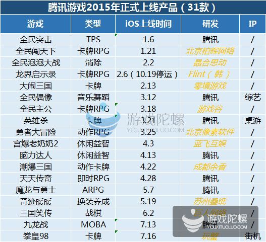 騰訊很大業(yè)務(wù)也很多,每個(gè)領(lǐng)域都可以去深究(如端游、頁(yè)游、H5),雖然騰訊的2015年早已被多家寫(xiě)過(guò),但這里我們將以另一個(gè)方向解讀,游戲陀螺眼中的騰訊游戲(手游業(yè)務(wù))。
