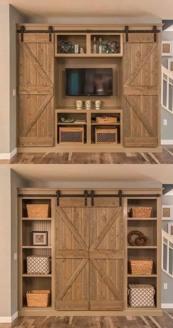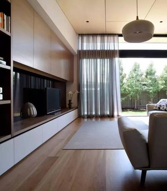 ▼也可以做兩扇大梭門,不看電視時關(guān)上門,兩邊的展示柜會露出來,而如果想看電視,就會遮住展示柜,成為一個毫無破綻的背景墻~