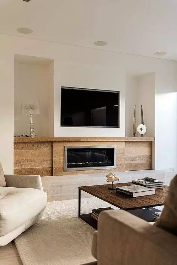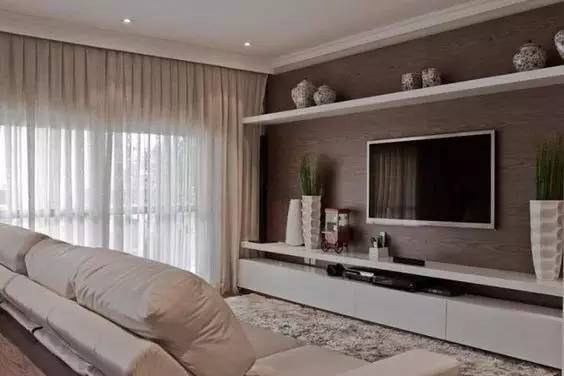 ▼當(dāng)然,還有一種鑲嵌式背景墻。電視嵌入墻壁里,與墻壁合為一體成為背景的一部分~