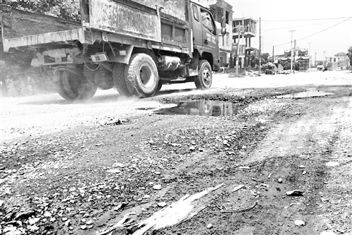 不時有工程車輛駛過,整條路路面坑坑洼洼,十分不平整