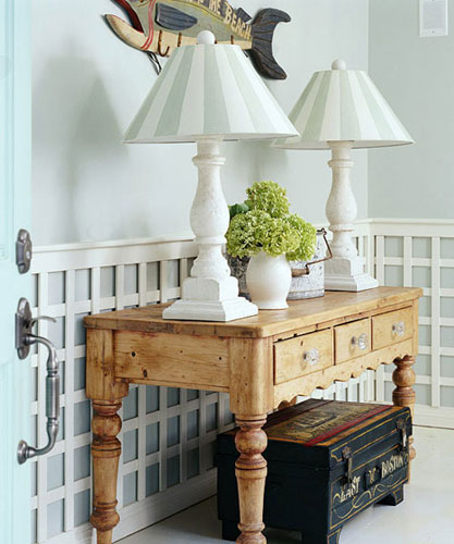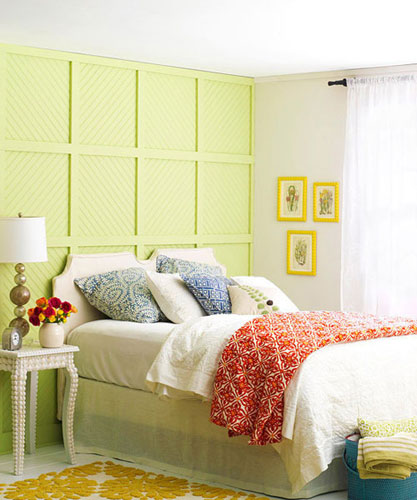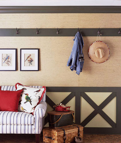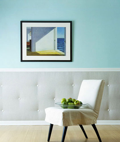 通過木板和織物裝點墻面,先將護(hù)墻板固定在一個高度,在填充上泡沫塑料或者是棉花,再裝飾上好看的布料,釘上紐扣,立刻就讓前面獨特起來。