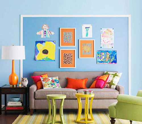 家中孩子的繪畫作品總是不少,那就利用這些繪畫成為裝飾墻面的元素,展示孩子最喜歡的作品。制作一個大大的墻框架,中間涂成藍(lán)色,錯落有致的擺放上孩子的繪畫作品。