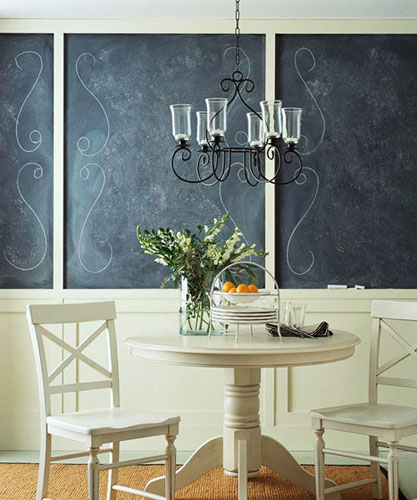 直接將墻面涂成黑色,成為一塊黑板,在黑板上描繪上曲線的粉筆線條,使這個空間呈現(xiàn)出小酒館的味道。在墻面上還擺放上小粉筆和小黑板擦,可以隨時改變圖案,趣味十足呢。